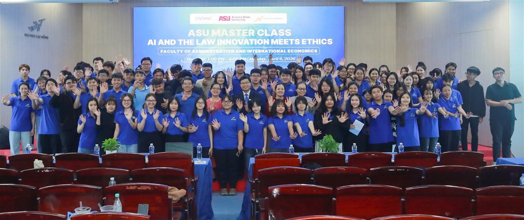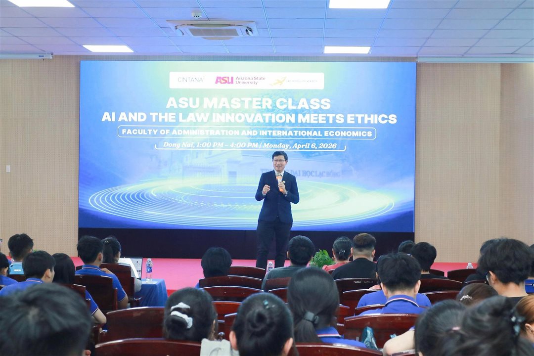 Chiều ngày 06/4/2026, Khoa Quản trị – Kinh tế Quốc tế, Trường Đại học Lạc Hồng đã tổ chức chương trình ASU Master Class: Innovation Meets Ethics dành cho sinh viên ngành Luật và Luật Kinh tế. Chương trình được triển khai trong khuôn khổ hợp tác học thuật, hướng đến việc trang bị cho sinh viên nền tảng kiến thức và tư duy tiếp cận các vấn đề pháp lý trong bối cảnh chuyển đổi số.