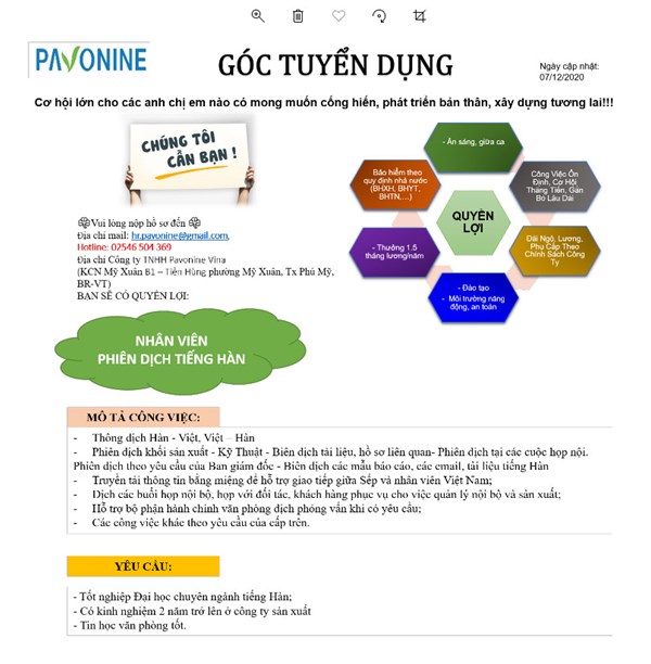 Công ty Pavonine cần tuyển nhân viên phiên dịch tiếng Hàn