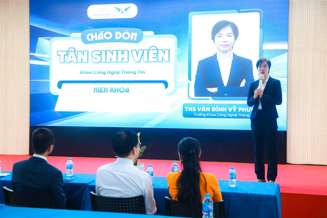 Phát biểu mở đầu chương trình, Cô Văn Đình Vỹ Phương – Trưởng Khoa CNTT, gửi lời chúc mừng đến toàn thể tân sinh viên, đồng thời chia sẻ định hướng trong học tập và phát triển cá nhân: