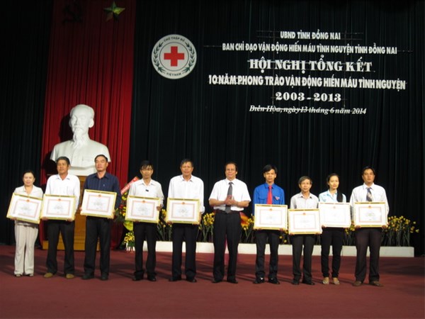 Dong Nai province’s Steering Committee of the Voluntary Blood Donation Campaign on June 13 held a ceremony to review blood donation movement 2003 - 2013 period, at the Provincial Convention and Events center. Representatives of Southern region's Red Cross Association, leaders of Dong Nai People's Committee, Red Cross Association and blood donors attended the ceremony.