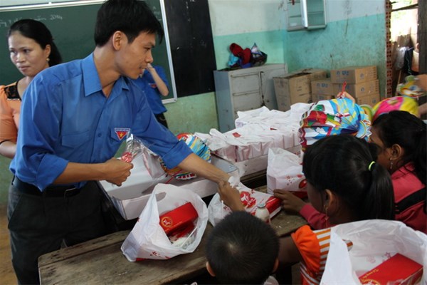 Representative of LHU Youth Union Tran Tien presented moon cakes to children.