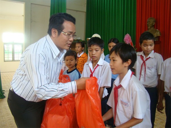 Comrade Truong Hai Thi presenting notebooks to pupils