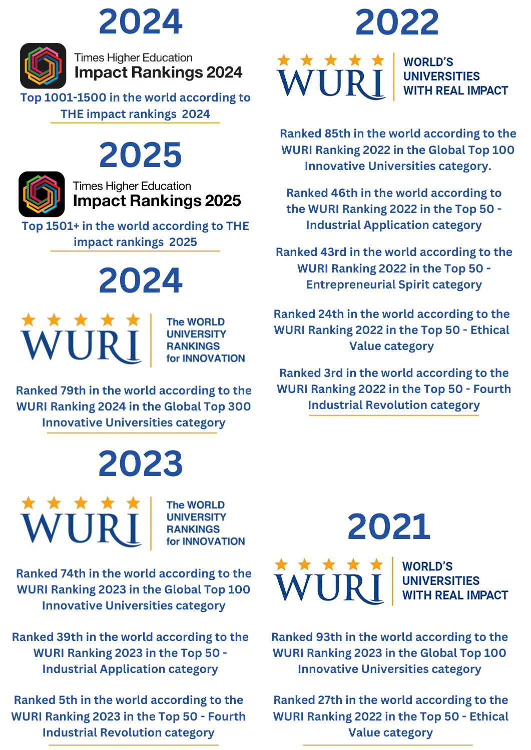 The First WURI Ranking in 2020: This inaugural ranking covered the Global Top 100 and the Top 50 in four key areas: Industrial Application, Entrepreneurial Spirit, Ethical Value, and Student Mobility and Openness. The focus of the ranking is on measuring innovative practices and real-world contributions by universities in various sectors, rather than simply academic achievements.
