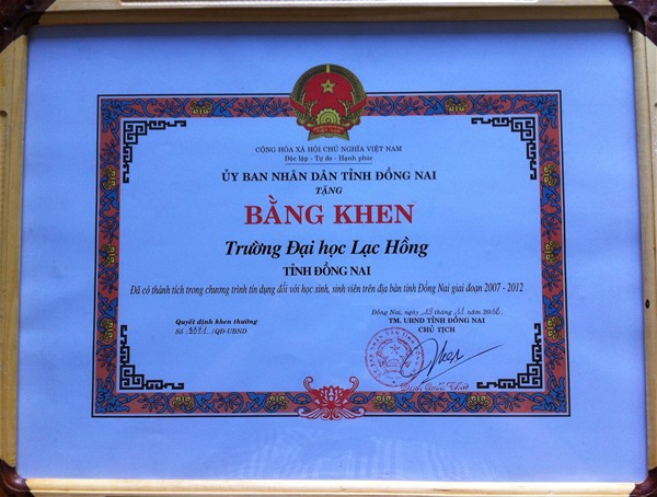 Tại Hội nghị này, trường Đại học Lạc Hồng đã vinh dự được UBND tỉnh Đồng Nai tặng Bằng khen vì đã có thành tích trong chương trình tín dụng đối với học sinh, sinh viên trên địa bàn tỉnh Đồng Nai giai đoạn 2007 – 2012.