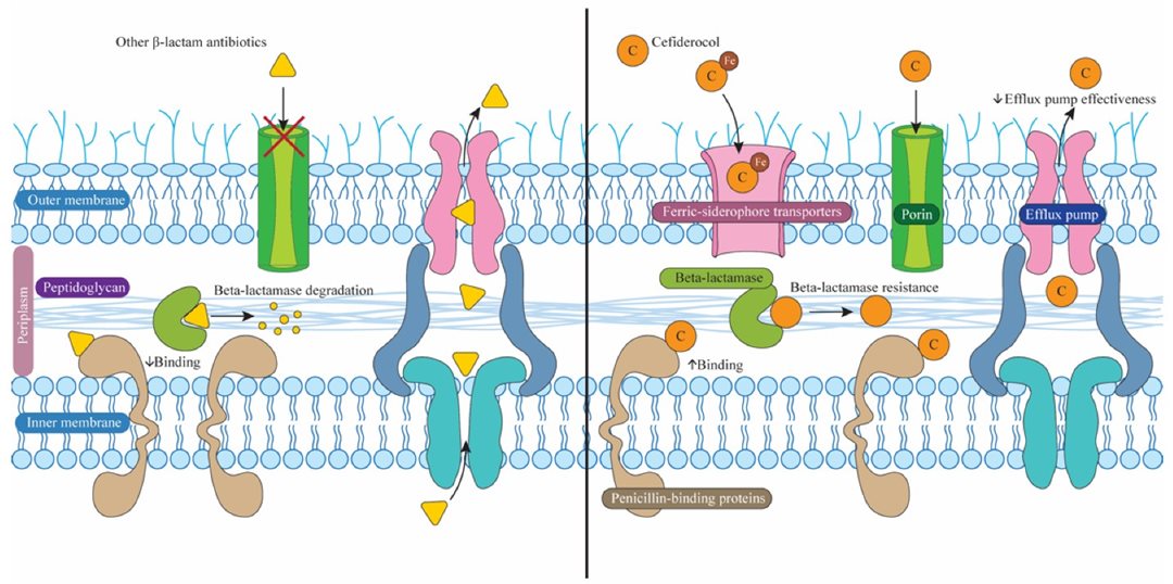 • Vi khuẩn Gram âm cần sắt để sinh trưởng và có các kênh vận chuyển sắt chủ động trên màng tế bào. Cefiderocol "ngụy trang" bằng cách gắn với sắt, khiến vi khuẩn lầm tưởng và chủ động vận chuyển phức hợp thuốc-sắt này qua màng ngoài vào khoang chu chất.